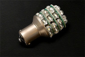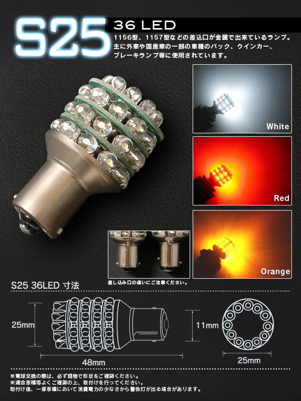 S25 36LED発光色ホワイトの砲弾型LED36個を使用しているものです。 正面に4mmの砲弾LEDを9個、サイドに4mm砲弾LEDを9個×3段使用しております。サイドに多くのLEDを使用していますので、正面がまぶしいと言うことはありませんが、ランプ内全体が明るくなります。