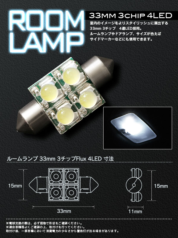 33mm 3CHIP Flux 4LED ルームランプ発光色ホワイトの5mmレンズ付き3chip flux LEDを4個を使用しているものです。 |