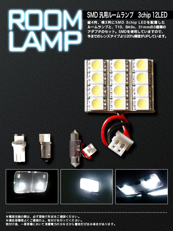縦4列、横3列にSMD 3chip LEDを配置したルームランプと、T10、BA9s、31mmの3種類のアダプタのセット。SMDを使用していますので、今までのレンズタイプより20%輝度がUPしています。
