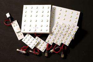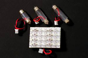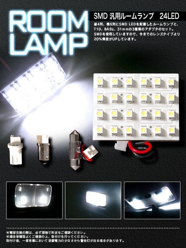 縦4列、横6列にSMD LEDを配置したルームランプと、T10、BA9s、31mmの3種類のアダプタのセット。