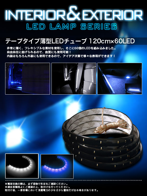 テープタイプ極薄LEDチューブ 120cm×60LEDエアロの下、アンダースポイラー、内装などアイデア次第で色々と使うことができます。裏面がシールになっているの、簡単に取り付けることができます。 2cm間隔でLEDチップが配置されています。3つのLEDと1つの抵抗で1ユニット(長さ6cm)になっていますので、6の倍数センチであれば好きな長さにすることが可能です。 コードは一方14cm、もう一方は149cmとなります。本商品2つ以上をコード同士接続することで延長することが可能です。(2本で60cm、3本で90cmとなります。他の長さの物とつなぎ合わせての使用も可能ですが、同色でも若干色が異なる可能性がございます。)