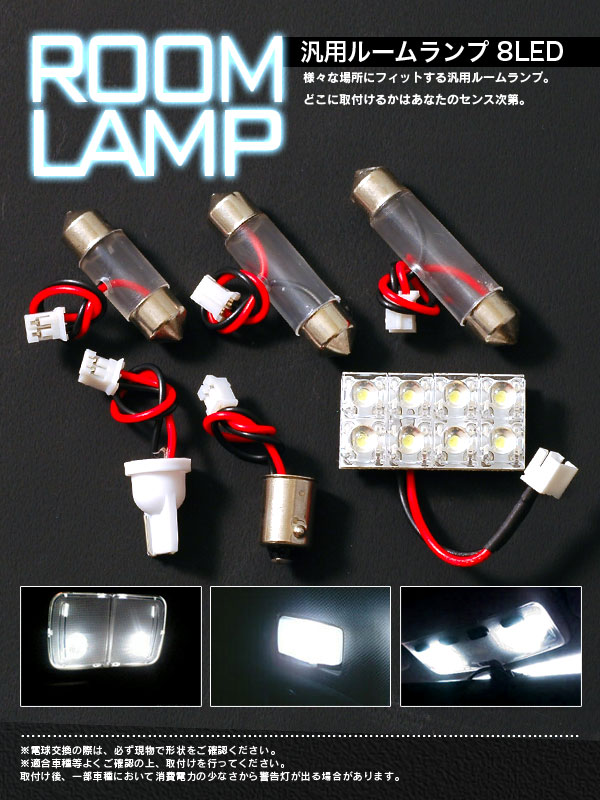 FLUX 汎用ルームランプ 8LED発光色ホワイトのレンズなしflux LEDを8個を使用しているものです。 対応の形状はT10、BA9s、T10×31、T10×37、T10×41の五種類ですが、ソケット側に遊びがある場合には、36mmや42mmの物にも使用できます。 ルームランプやドアランプ、サイズが合えばサイドマーカーなどにも使用できます。