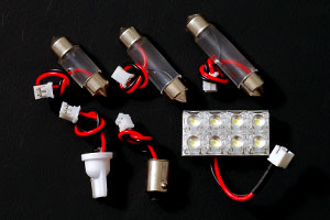縦4列、横6列にSMD LEDを配置したルームランプと、T10、BA9s、31mmの3種類のアダプタのセット。